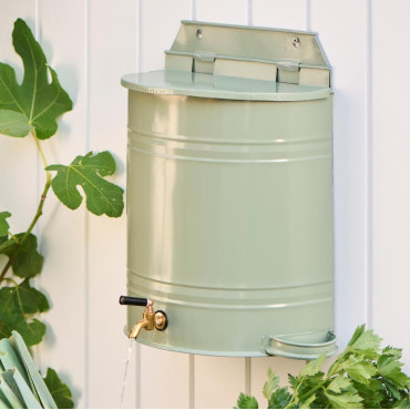 Kovový zásobník na vodu s kohútikom v mentolovo zelenej farbe.