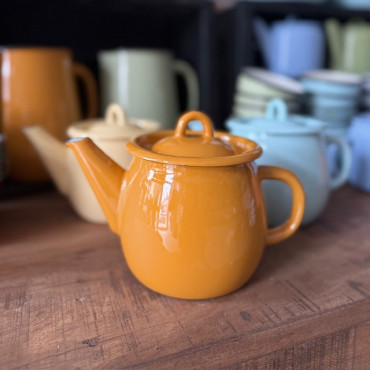 Nádherný smaltovaný čajníček s objemom 1000 ml v krásnej horčicovo žltej farbe.