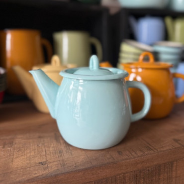 Nádherný smaltovaný čajníček s objemom 1000 ml v svetlomodrej farbe.
