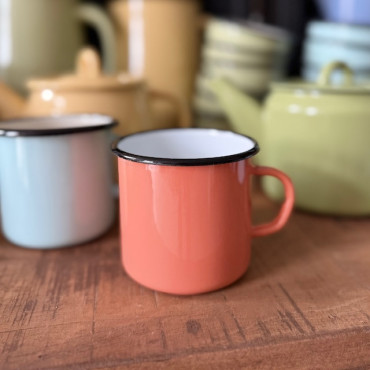 Nádherný smaltovaný hrnček s objemom 350 ml v marhuľovej farbe.