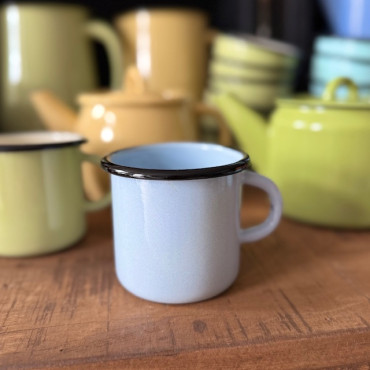 Nádherný smaltovaný hrnček s objemom 350 ml v svetlosivej farbe.