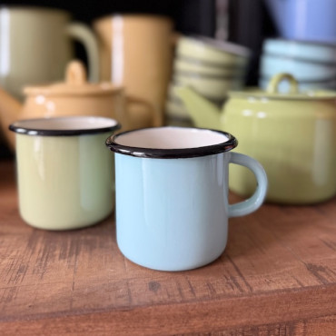 Nádherný smaltovaný hrnček s objemom 350 ml v svetlomodrej farbe.