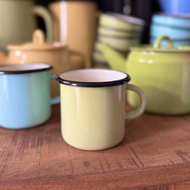 Nádherný smaltovaný hrnček s objemom 350 ml v svetlozelenej farbe.