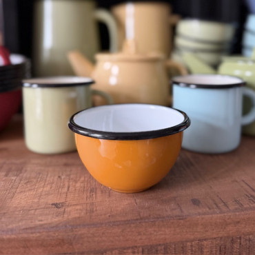 Krásna smaltovaná miska ideálna na rajčinky, oriešky či keksíky s objemom 350 ml v krásnej horčicovej farbe.