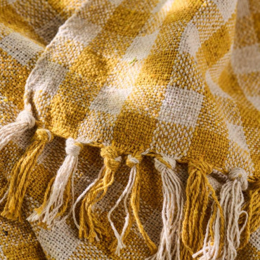 Prekrásny prehoz zo 100% bavlny v kombinácii prírodnej farby a žltej kocky. Možno prať v práčke na 30 stupňov.