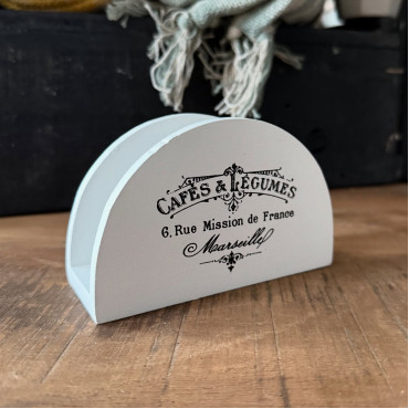 Krásny a praktický drevený stojan na servítky v bielej farbe s čiernym nápisom.