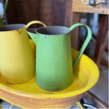 Nádherný kovový džbánik v zelenej farbe s vintage efektom v podobe vyšúchaných miest.