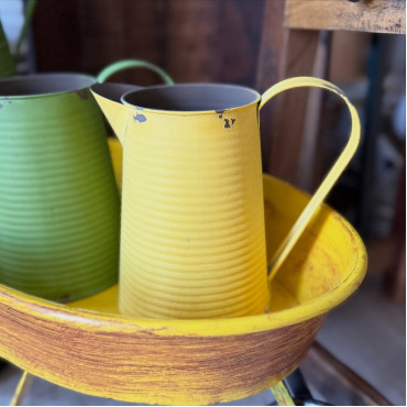 Nádherný kovový džbánik v žltej farbe s vintage efektom v podobe vyšúchaných miest.