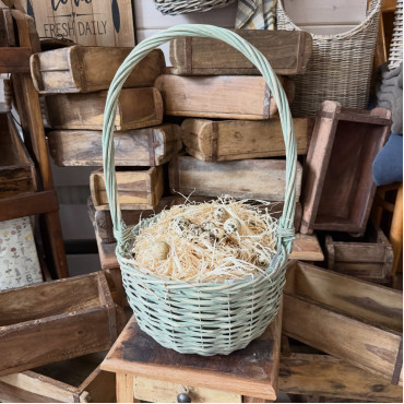 Krásny prútený košík s rúčkou v zelenej farbe s igelitovou výplňou.