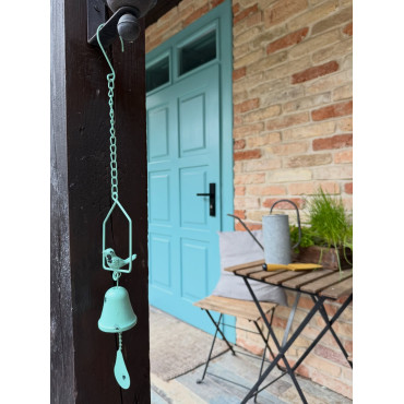 Nádherná závesná kovová dekorácia so zvončekom a vtáčikom v krásnej mentolovej farbe.
