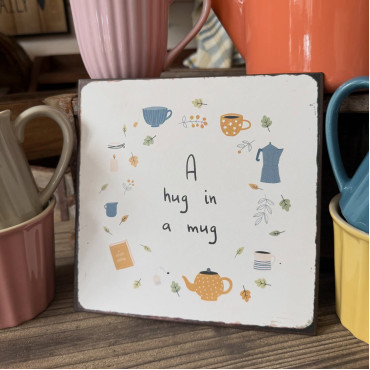 Rozkošná kovová tabuľka pre všetkých milovníkov čaju a kávičky s nápisom Hug in a mug (Objatie v hrnčeku).