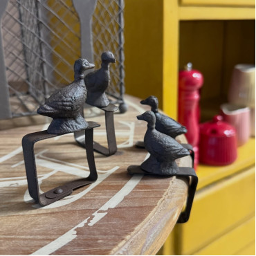 Set štyroch kusov kovových spon na obrus vo vintage štýle s húskou.