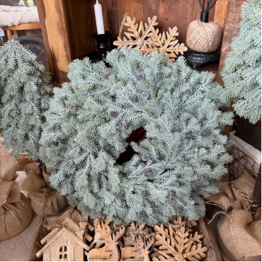 Nádherný bohatý umelý veniec z hustej čečiny s jemnými šiškami.